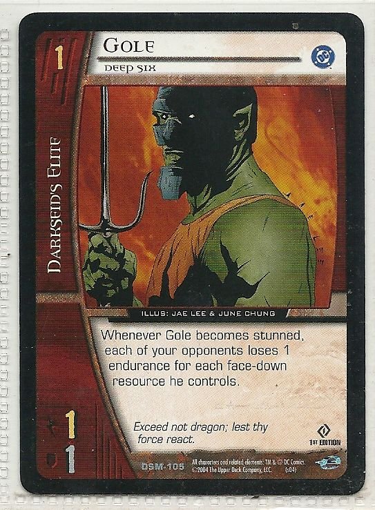 more Great cards @ www.everythingcollectibles.biz For Sale is a vs system Man of Steel Card DSM-105 Gole Deep Six Uncommon. all single cards are shipped in Penny Sleeves and top loaders. all orders ship with delivery confirmation as well. we usually ship within 2 days of receiving an order. Shipping is a Flat $2 no matter how many cards you buy 1 or 1000 its still $2.