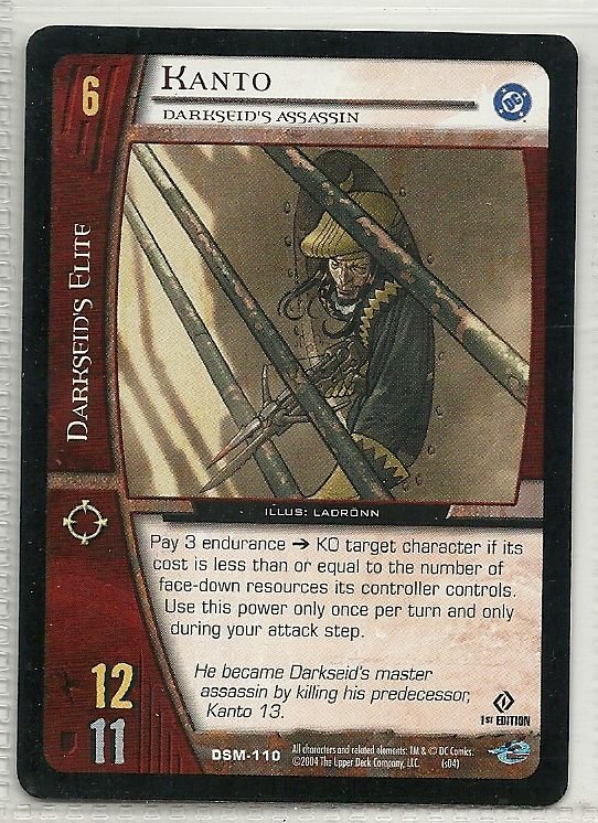 more Great cards @ www.everythingcollectibles.biz For Sale is a vs system Man of Steel Card DSM-110 Kanto Darkseid's Assassinr common. all single cards are shipped in Penny Sleeves and top loaders. all orders ship with delivery confirmation as well. we usually ship within 2 days of receiving an order. Shipping is a Flat $2 no matter how many cards you buy 1 or 1000 its still $2.