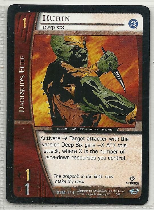 more Great cards @ www.everythingcollectibles.biz For Sale is a vs system Man of Steel Card DSM-111 Kurin Deep Six Uncommon. all single cards are shipped in Penny Sleeves and top loaders. all orders ship with delivery confirmation as well. we usually ship within 2 days of receiving an order. Shipping is a Flat $2 no matter how many cards you buy 1 or 1000 its still $2.