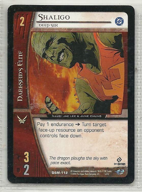 more Great cards @ www.everythingcollectibles.biz For Sale is a vs system Man of Steel Card DSM-112 Shaligo Deep Six common. all single cards are shipped in Penny Sleeves and top loaders. all orders ship with delivery confirmation as well. we usually ship within 2 days of receiving an order. Shipping is a Flat $2 no matter how many cards you buy 1 or 1000 its still $2.