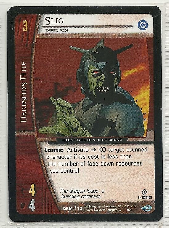 more Great cards @ www.everythingcollectibles.biz For Sale is a vs system Man of Steel Card DSM-113 Slig Deep Six common. all single cards are shipped in Penny Sleeves and top loaders. all orders ship with delivery confirmation as well. we usually ship within 2 days of receiving an order. Shipping is a Flat $2 no matter how many cards you buy 1 or 1000 its still $2.
