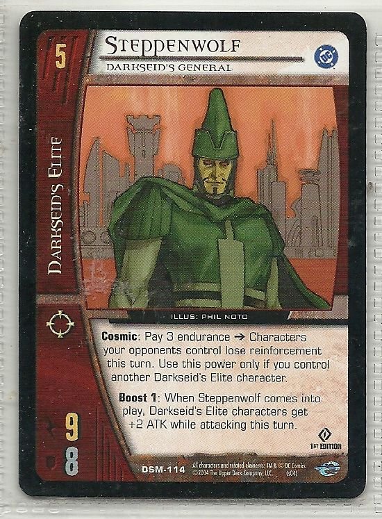 more Great cards @ www.everythingcollectibles.biz For Sale is a vs system Man of Steel Card DSM-114 Steppenwolf Darkseid's General common. all single cards are shipped in Penny Sleeves and top loaders. all orders ship with delivery confirmation as well. we usually ship within 2 days of receiving an order. Shipping is a Flat $2 no matter how many cards you buy 1 or 1000 its still $2.