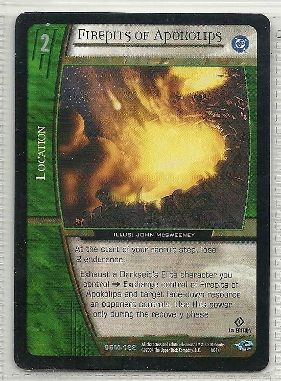 more Great cards @ www.everythingcollectibles.biz For Sale is a vs system Man Of Steel Card DSM-122 Firepits Of Apokolips. all single cards are shipped in Penny Sleeves and top loaders. all orders ship with delivery confirmation as well. we usually ship within 2 days of receiving an order. Shipping is a Flat $2 no matter how many cards you buy 1 or 1000 its still $2.