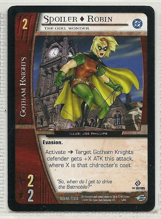 more Great cards @ www.everythingcollectibles.biz For Sale is a vs system Man of Steel Card DSM-133 Spoiler @ Robin The Girl Wonder Uncommon. all single cards are shipped in Penny Sleeves and top loaders. all orders ship with delivery confirmation as well. we usually ship within 2 days of receiving an order. Shipping is a Flat $2 no matter how many cards you buy 1 or 1000 its still $2.