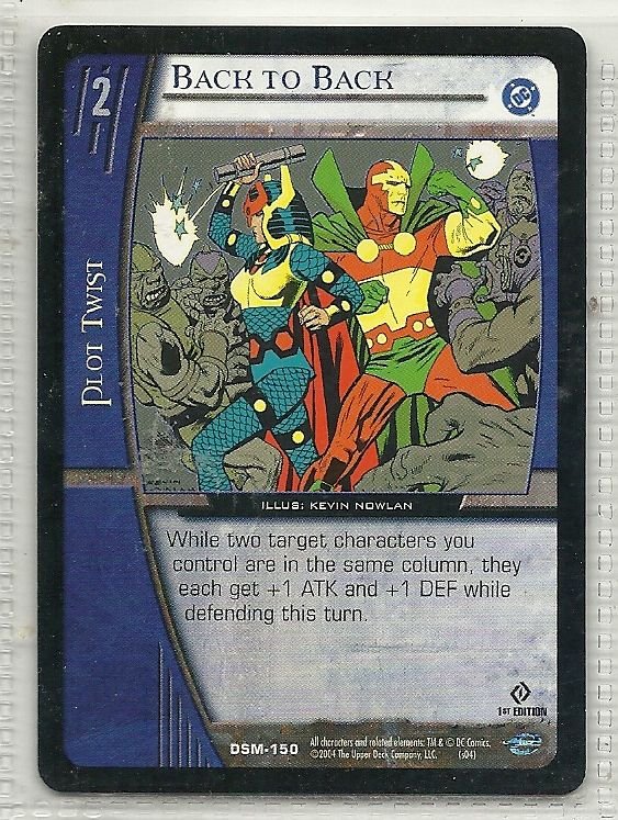 more Great cards @ www.everythingcollectibles.biz For Sale is a vs system Man Of Steel Card DSM-150 Back to Back Common. all single cards are shipped in Penny Sleeves and top loaders. all orders ship with delivery confirmation as well. we usually ship within 2 days of receiving an order. Shipping is a Flat $2 no matter how many cards you buy 1 or 1000 its still $2.