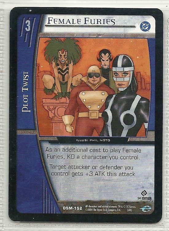 more Great cards @ www.everythingcollectibles.biz For Sale is a vs system Man Of Steel Card DSM-152 Female Furies Common. all single cards are shipped in Penny Sleeves and top loaders. all orders ship with delivery confirmation as well. we usually ship within 2 days of receiving an order. Shipping is a Flat $2 no matter how many cards you buy 1 or 1000 its still $2.