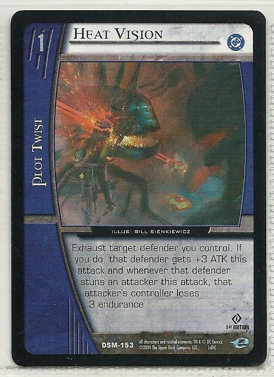 more Great cards @ www.everythingcollectibles.biz For Sale is a vs system Man Of Steel Card DSM-153 Heat Vision Common. all single cards are shipped in Penny Sleeves and top loaders. all orders ship with delivery confirmation as well. we usually ship within 2 days of receiving an order. Shipping is a Flat $2 no matter how many cards you buy 1 or 1000 its still $2.