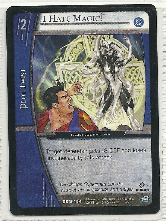 more Great cards @ www.everythingcollectibles.biz For Sale is a vs system Man Of Steel Card DSM-154 I Hate Magic! Common. all single cards are shipped in Penny Sleeves and top loaders. all orders ship with delivery confirmation as well. we usually ship within 2 days of receiving an order. Shipping is a Flat $2 no matter how many cards you buy 1 or 1000 its still $2.
