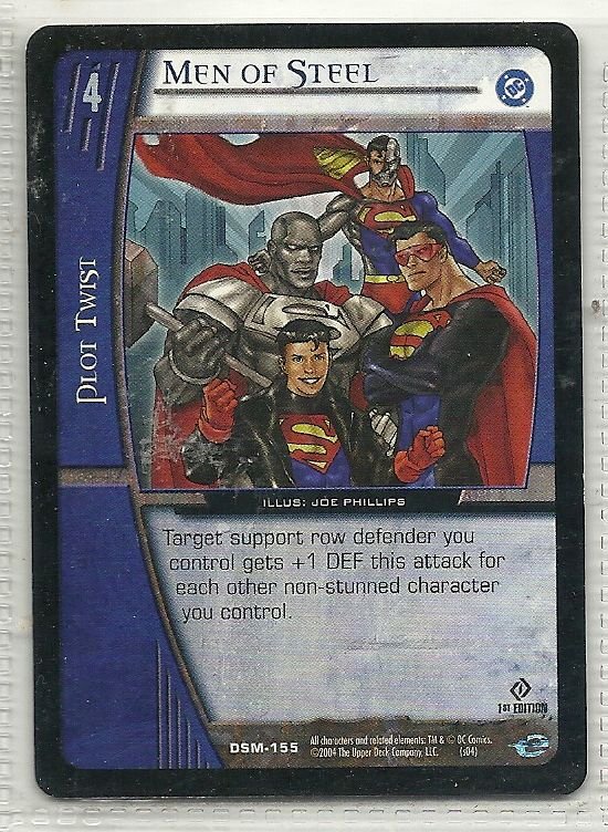 more Great cards @ www.everythingcollectibles.biz For Sale is a vs system Man Of Steel Card DSM-155 Men of Steel Common. all single cards are shipped in Penny Sleeves and top loaders. all orders ship with delivery confirmation as well. we usually ship within 2 days of receiving an order. Shipping is a Flat $2 no matter how many cards you buy 1 or 1000 its still $2.