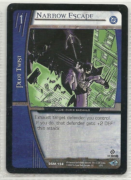 more Great cards @ www.everythingcollectibles.biz For Sale is a vs system Man Of Steel Card DSM-158 Narrow Escape Common. all single cards are shipped in Penny Sleeves and top loaders. all orders ship with delivery confirmation as well. we usually ship within 2 days of receiving an order. Shipping is a Flat $2 no matter how many cards you buy 1 or 1000 its still $2.