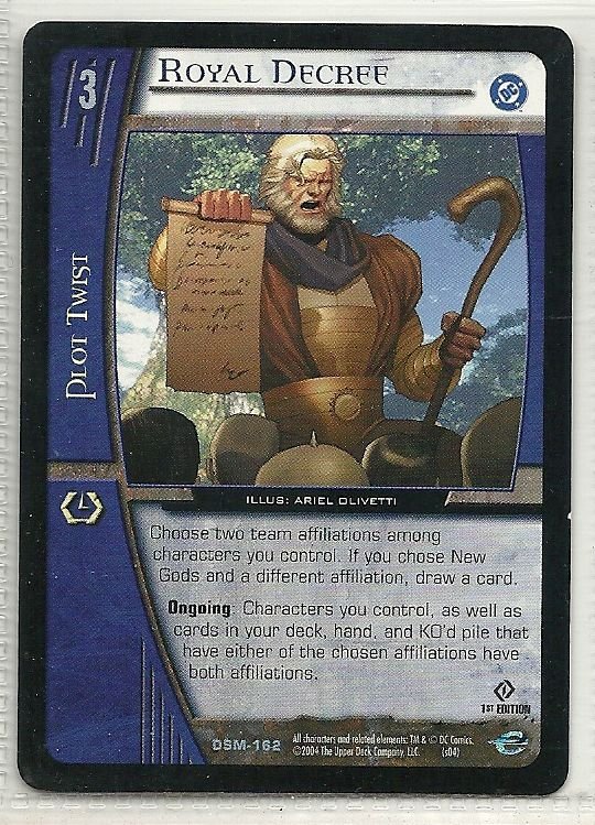 more Great cards @ www.everythingcollectibles.biz For Sale is a vs system Man Of Steel Card DSM-162 Royal Decree Uncommon. all single cards are shipped in Penny Sleeves and top loaders. all orders ship with delivery confirmation as well. we usually ship within 2 days of receiving an order. Shipping is a Flat $2 no matter how many cards you buy 1 or 1000 its still $2