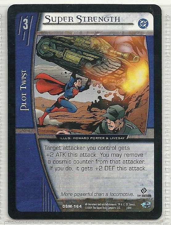 more Great cards @ www.everythingcollectibles.biz For Sale is a vs system Man Of Steel Card DSM-164 Super Strength Common. all single cards are shipped in Penny Sleeves and top loaders. all orders ship with delivery confirmation as well. we usually ship within 2 days of receiving an order. Shipping is a Flat $2 no matter how many cards you buy 1 or 1000 its still $2