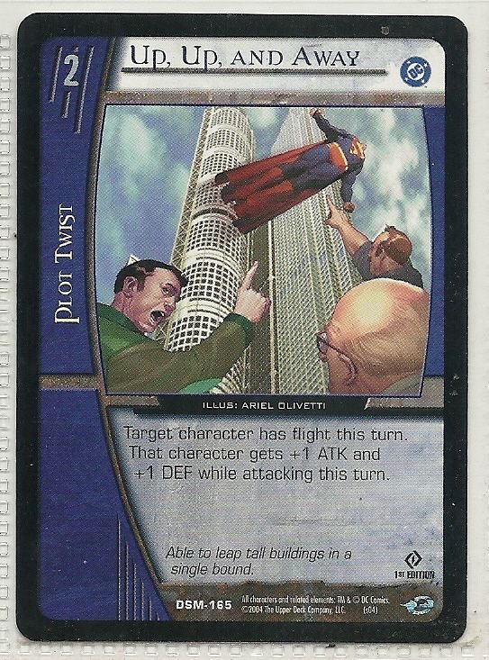 more Great cards @ www.everythingcollectibles.biz For Sale is a vs system Man Of Steel Card DSM-165 Up, Up, and Away Common. all single cards are shipped in Penny Sleeves and top loaders. all orders ship with delivery confirmation as well. we usually ship within 2 days of receiving an order. Shipping is a Flat $2 no matter how many cards you buy 1 or 1000 its still $