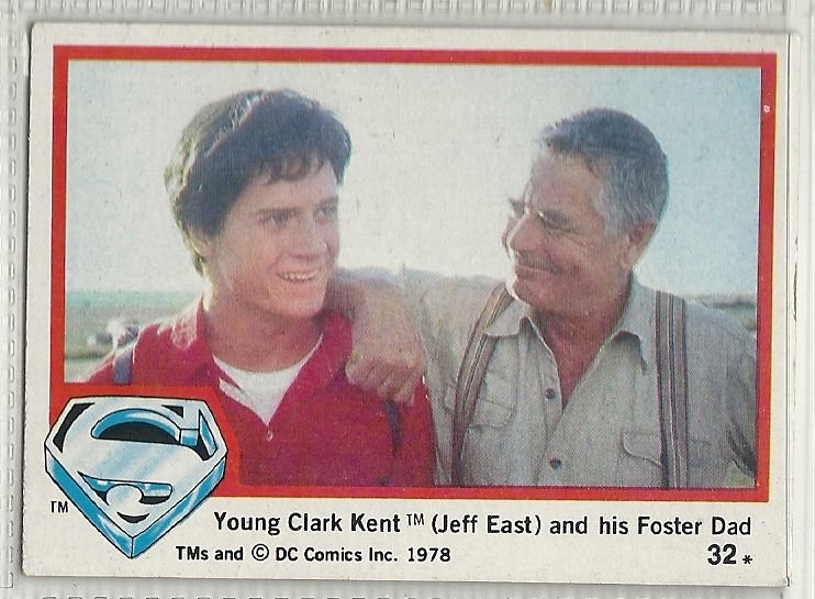 more Great cards @ www.everything-collectibles.com For Sale is a 1978 Topps Superman Card #32 Young Clark Kent (Jeff East) and his Foster Dad. all single cards are shipped in Penny Sleeves and top loaders. if you have any questions please don't hesitate to ask. Fast same or next day shipping with delivery confirmation within the U.S. Shipping For each additional Card is Free within the United States.