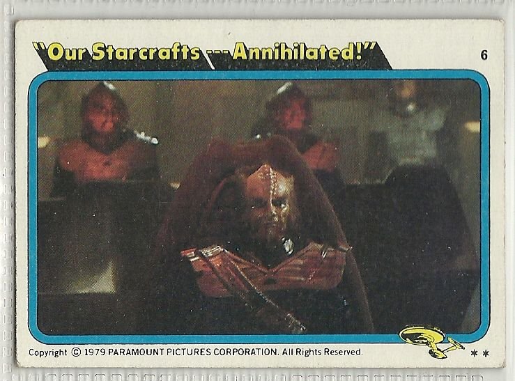 more Great cards @ www.everythingcollectibles.biz For Sale is a 1979 Topps Star Trek The Motion Picture Card #6 Our Starcrafts�Annihilated!. all single cards are shipped in Penny Sleeves and top loaders. if you have any questions please don't hesitate to ask. Fast same or next day shipping with delivery confirmation within the U.S. Shipping For each additional Card is Free within the United States.