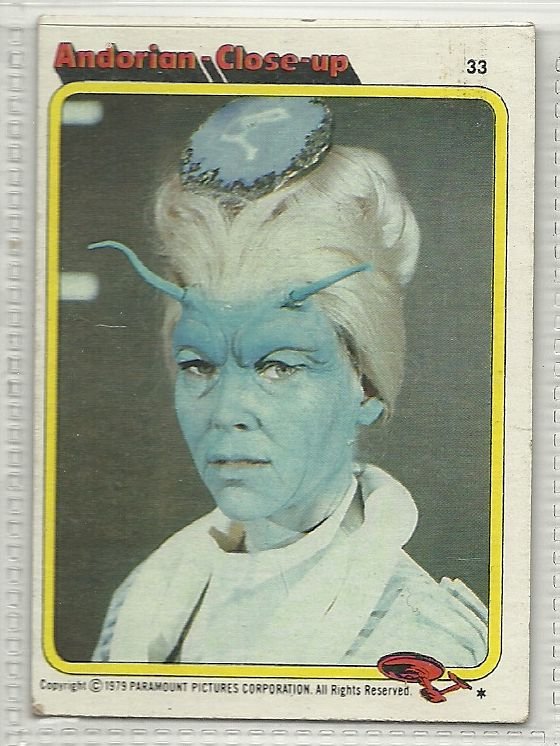 more Great cards @ www.everythingcollectibles.biz For Sale is a 1979 Topps Star Trek The Motion Picture Card #33 Andorian Close-up. all single cards are shipped in Penny Sleeves and top loaders. if you have any questions please don't hesitate to ask. Fast same or next day shipping with delivery confirmation within the U.S. Shipping For each additional Card is Free within the United States.
