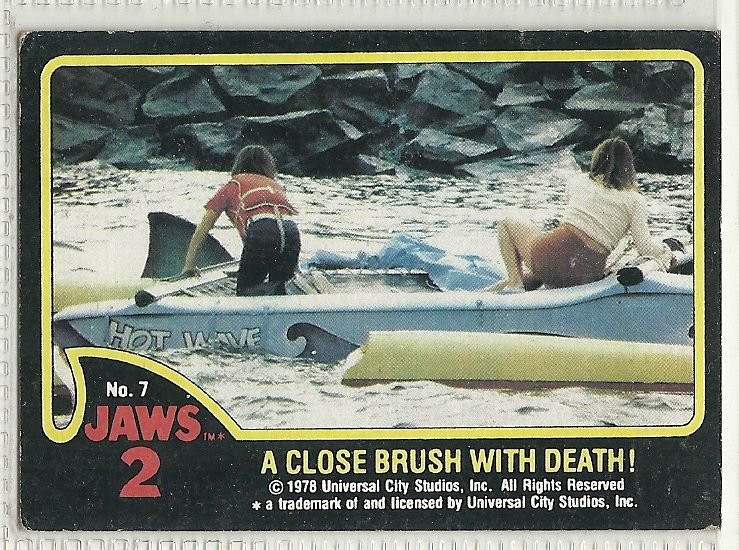 more Great cards @ www.everything-collectibles.com For Sale is a 1978 Topps Jaws 2 Card #7 A Close Brush with Death!. all single cards are shipped in Penny Sleeves and top loaders. if you have any questions please don't hesitate to ask. Fast same or next day shipping with delivery confirmation within the U.S. Shipping For each additional Card is Free within the United States.