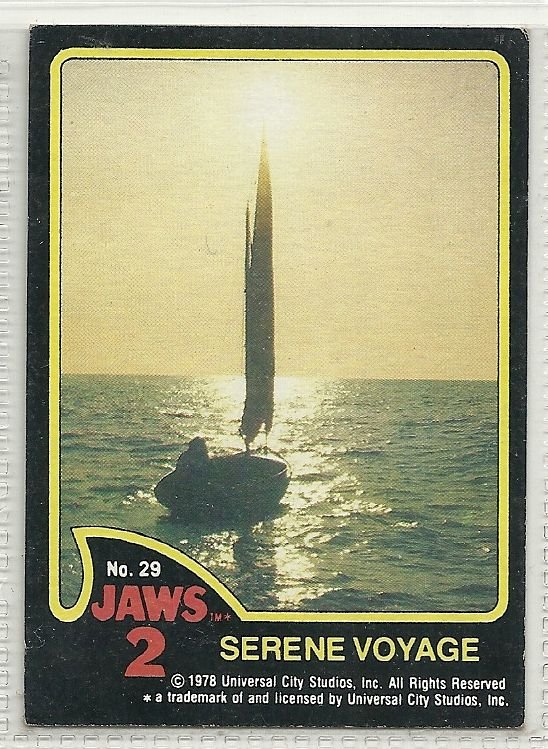 more Great cards @ www.everything-collectibles.com For Sale is a 1978 Topps Jaws 2 Card #29 Serene Voyage. all single cards are shipped in Penny Sleeves and top loaders. if you have any questions please don't hesitate to ask. Fast same or next day shipping with delivery confirmation within the U.S. Shipping For each additional Card is Free within the United States.