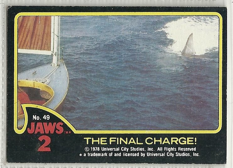 more Great cards @ www.everything-collectibles.com For Sale is a 1978 Topps Jaws 2 Card #49 The Final Charge!. all single cards are shipped in Penny Sleeves and top loaders. if you have any questions please don't hesitate to ask. Fast same or next day shipping with delivery confirmation within the U.S. Shipping For each additional Card is Free within the United States.