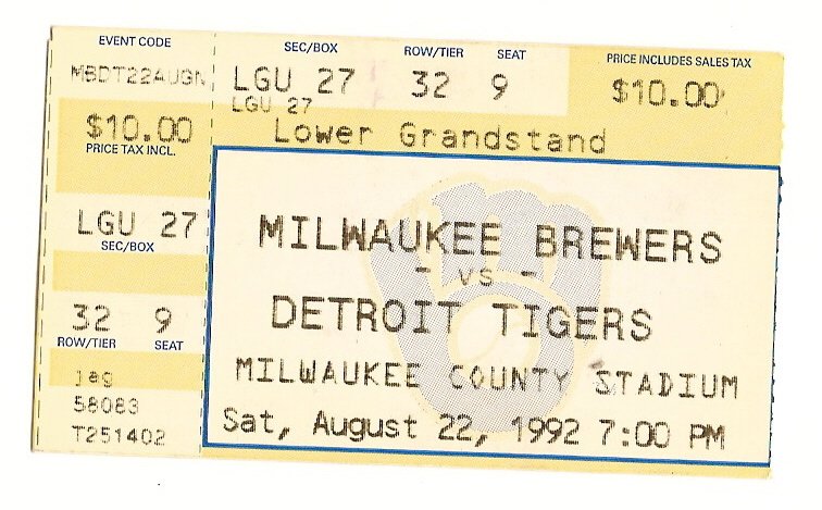 1992 Detroit Tigers @ Milwaukee Brewers ticket stub August 22st Yount 3 hits
