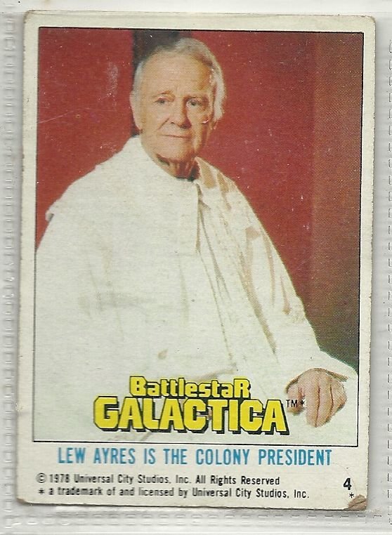 more Great cards @ www.everything-collectibles.com For Sale is a 1978 Topps Battlestar Galactica #4 Lew Ayres Is the Colony President. all single cards are shipped in Penny Sleeves and top loaders. if you have any questions please don't hesitate to ask. Fast same or next day shipping with delivery confirmation within the U.S. Shipping For each additional Card is Free within the United States.