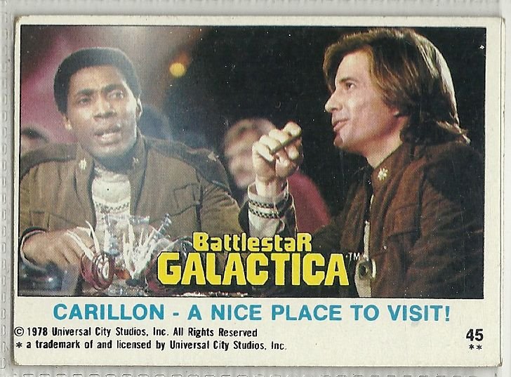more Great cards @ www.everything-collectibles.com For Sale is a 1978 Topps Battlestar Galactica #45 Carillon - A Nice Place to Visit!. all single cards are shipped in Penny Sleeves and top loaders. if you have any questions please don't hesitate to ask. Fast same or next day shipping with delivery confirmation within the U.S. Shipping For each additional Card is Free within the United States.
