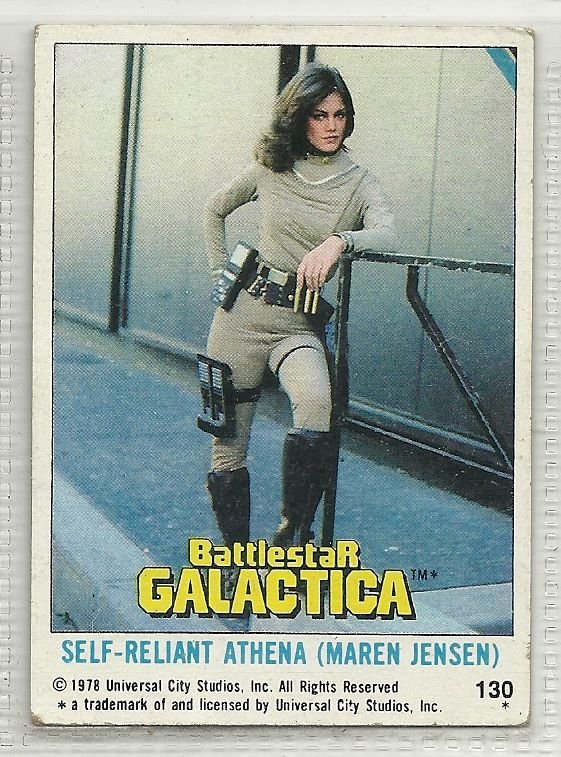 more Great cards @ www.everything-collectibles.com For Sale is a 1978 Topps Battlestar Galactica #130 Self-Reliant Athena (Maren Jensen). all single cards are shipped in Penny Sleeves and top loaders. if you have any questions please don't hesitate to ask. Fast same or next day shipping with delivery confirmation within the U.S. Shipping For each additional Card is Free within the United States.