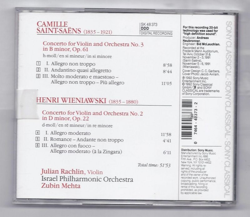 More Great CD's @ www.everything-collectibles.com For Sale is an Julian Rachlin Israel Philharmonic Orchestra Zubin Mehta CD. in good used condition. adult owned from private collection. please see photo for more details. what you see is what you will recieve. please dont hees