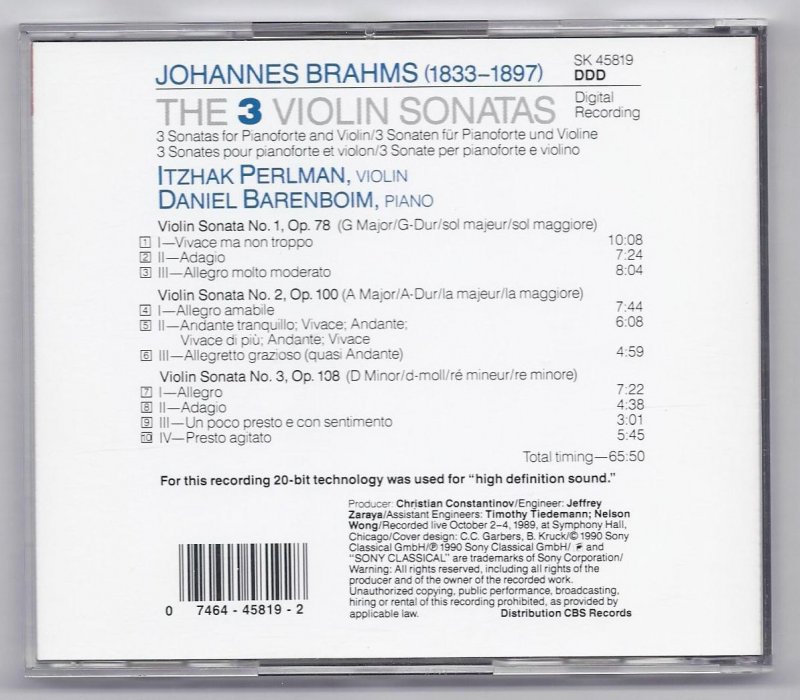Itzhak Perlman Violin Daniel Barenboim Piano Music CD