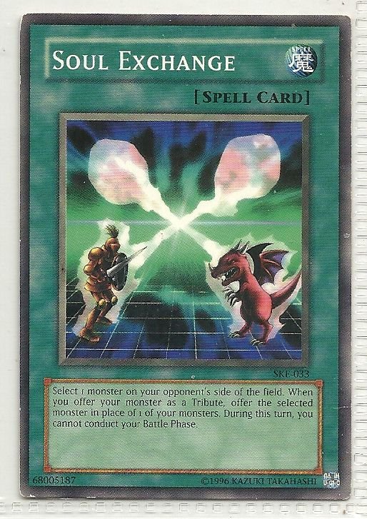 more Great cards @ www.everythingcollectibles.biz For Sale is a YuGiOh American Kaiba Evolution Deck Single Card SKE-033 Soul Exchange. all single cards are shipped in Penny Sleeves and top loaders. all orders ship with delivery confirmation as well. we usually ship within 2 days of receiving an order. Shipping is a Flat $2 no matter how many cards you buy 1 or 1000 its still $2.