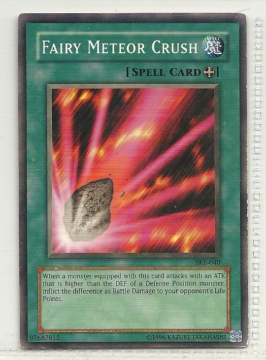 more Great cards @ www.everythingcollectibles.biz For Sale is a YuGiOh American Kaiba Evolution Deck Single Card SKE-040 Fairy Meteor Crush. all single cards are shipped in Penny Sleeves and top loaders. all orders ship with delivery confirmation as well. we usually ship within 2 days of receiving an order. Shipping is a Flat $2 no matter how many cards you buy 1 or 1000 its still $2.