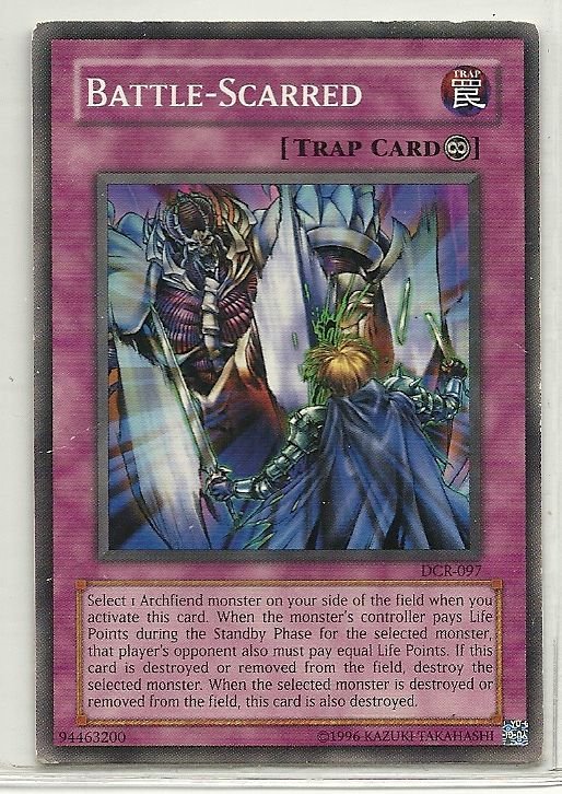 more Great cards @ www.everythingcollectibles.biz For Sale is a YuGiOh Dark Crisis Single Card Common DCR-097 Battle-Scarred. all single cards are shipped in Penny Sleeves and top loaders. all orders ship with delivery confirmation as well. we usually ship within 2 days of receiving an order. Shipping is a Flat $2 no matter how many cards you buy 1 or 1000 its still $2.