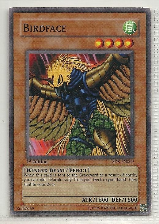 more Great cards @ www.everythingcollectibles.biz For Sale is a YuGiOh GX Lord of the Storm Single Card Common SD8-EN009 Birdface. all single cards are shipped in Penny Sleeves and top loaders. all orders ship with delivery confirmation as well. we usually ship within 2 days of receiving an order. Shipping is a Flat $2 no matter how many cards you buy 1 or 1000 its still $2.