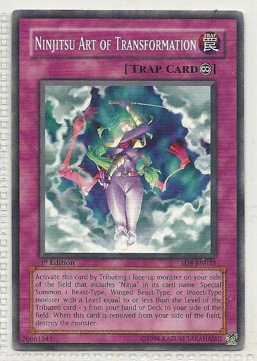 more Great cards @ www.everythingcollectibles.biz For Sale is a YuGiOh GX Lord of the Storm Single Card Common SD8-EN035 Ninjitsu Art of Transformation. all single cards are shipped in Penny Sleeves and top loaders. all orders ship with delivery confirmation as well. we usually ship within 2 days of receiving an order. Shipping is a Flat $2 no matter how many cards you buy 1 or 1000 its still $2.