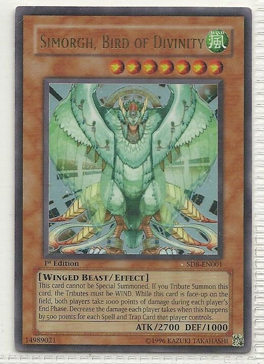 more Great cards @ www.everythingcollectibles.biz For Sale is a YuGiOh GX Lord of the Storm Single Card Super Rare SD8-EN001 Simorgh, Bird of Divinity. all single cards are shipped in Penny Sleeves and top loaders. all orders ship with delivery confirmation as well. we usually ship within 2 days of receiving an order. Shipping is a Flat $2 no matter how many cards you buy 1 or 1000 its still $2.