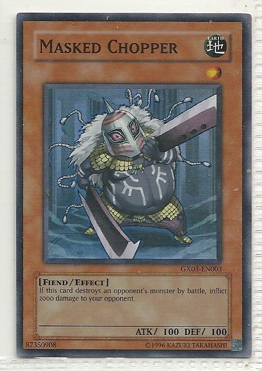 more Great cards @ www.everythingcollectibles.biz For Sale is a YuGiOh GX Spirit Caller Promo Single Card GX03-EN003 Masked Chopper. all single cards are shipped in Penny Sleeves and top loaders. all orders ship with delivery confirmation as well. we usually ship within 2 days of receiving an order. Shipping is a Flat $2 no matter how many cards you buy 1 or 1000 its still $2.