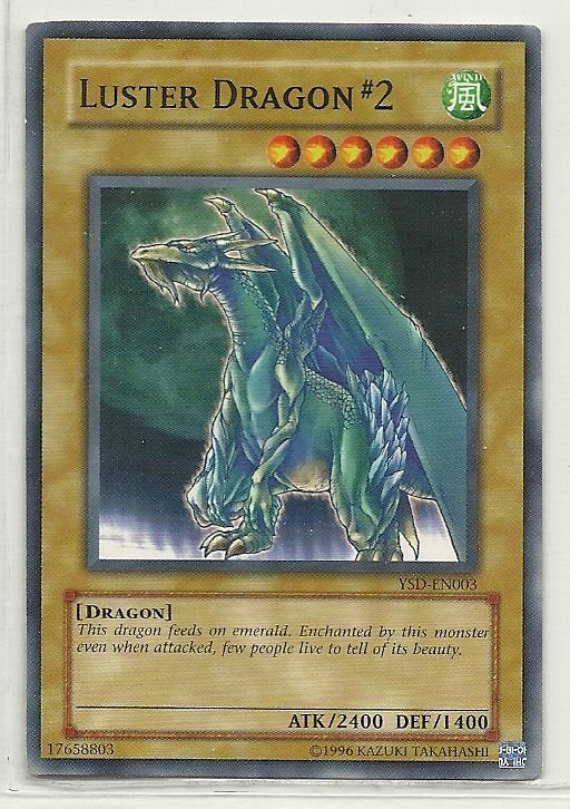 more Great cards @ www.everythingcollectibles.biz For Sale is a YuGiOh GX Starter Deck 2006 Single Card Common YSD-EN003 Luster Dragon #2. all single cards are shipped in Penny Sleeves and top loaders. all orders ship with delivery confirmation as well. we usually ship within 2 days of receiving an order. Shipping is a Flat $2 no matter how many cards you buy 1 or 1000 its still $2.