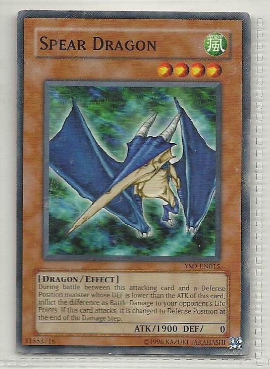 more Great cards @ www.everythingcollectibles.biz For Sale is a YuGiOh GX Starter Deck 2006 Single Card Common YSD-EN015 Spear Dragon. all single cards are shipped in Penny Sleeves and top loaders. all orders ship with delivery confirmation as well. we usually ship within 2 days of receiving an order. Shipping is a Flat $2 no matter how many cards you buy 1 or 1000 its still $2.