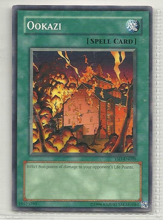 more Great cards @ www.everythingcollectibles.biz For Sale is a YuGiOh GX Starter Deck 2006 Single Card Common YSD-EN020 Ookazi. all single cards are shipped in Penny Sleeves and top loaders. all orders ship with delivery confirmation as well. we usually ship within 2 days of receiving an order. Shipping is a Flat $2 no matter how many cards you buy 1 or 1000 its still $2.