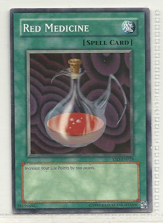 more Great cards @ www.everythingcollectibles.biz For Sale is a YuGiOh GX Starter Deck 2006 Single Card Common YSD-EN024 Red Medicine. all single cards are shipped in Penny Sleeves and top loaders. all orders ship with delivery confirmation as well. we usually ship within 2 days of receiving an order. Shipping is a Flat $2 no matter how many cards you buy 1 or 1000 its still $2.