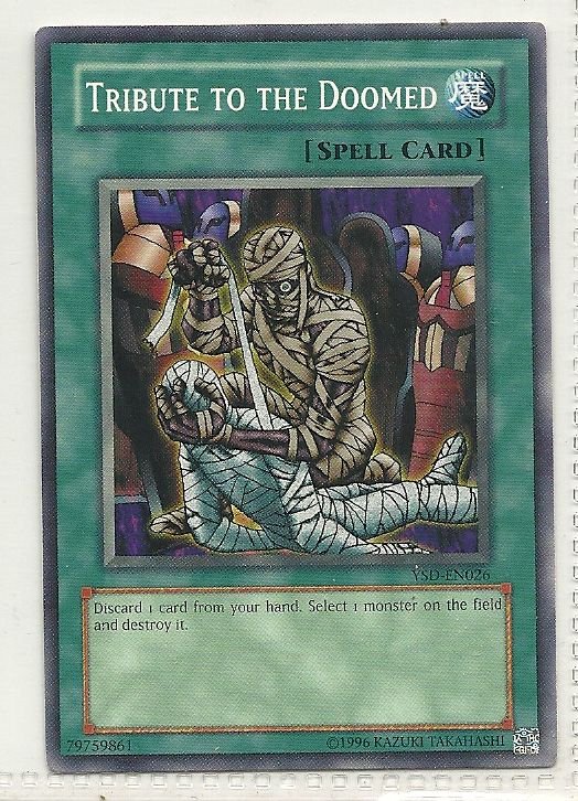 more Great cards @ www.everythingcollectibles.biz For Sale is a YuGiOh GX Starter Deck 2006 Single Card Common YSD-EN026 Tribute to the Doomed. all single cards are shipped in Penny Sleeves and top loaders. all orders ship with delivery confirmation as well. we usually ship within 2 days of receiving an order. Shipping is a Flat $2 no matter how many cards you buy 1 or 1000 its still $2