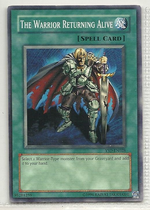 more Great cards @ www.everythingcollectibles.biz For Sale is a YuGiOh GX Starter Deck 2006 Single Card Common YSD-EN028 The Warrior Returning Alive. all single cards are shipped in Penny Sleeves and top loaders. all orders ship with delivery confirmation as well. we usually ship within 2 days of receiving an order. Shipping is a Flat $2 no matter how many cards you buy 1 or 1000 its s