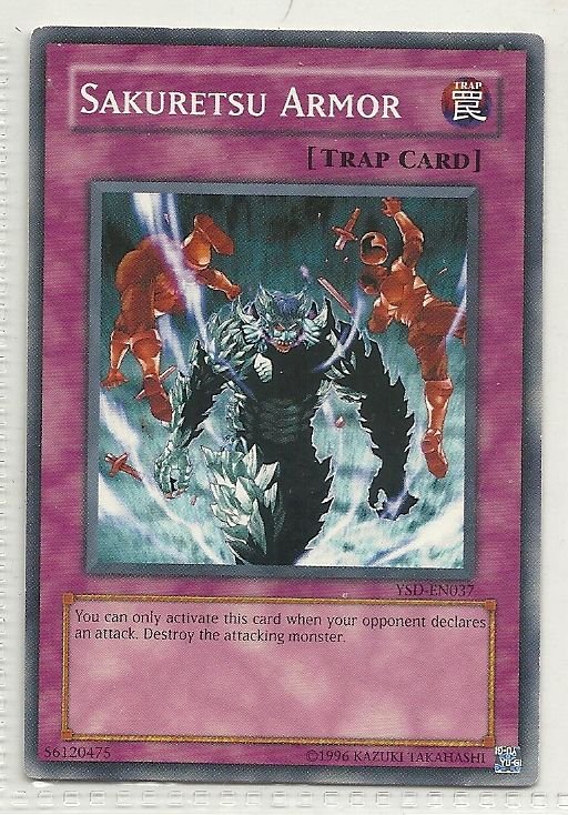more Great cards @ www.everythingcollectibles.biz For Sale is a YuGiOh GX Starter Deck 2006 Single Card Common YSD-EN037 Sakuretsu Armor. all single cards are shipped in Penny Sleeves and top loaders. all orders ship with delivery confirmation as well. we usually ship within 2 days of receiving an order. Shipping is a Flat $2 no matter how many cards you buy 1 or 1000 its