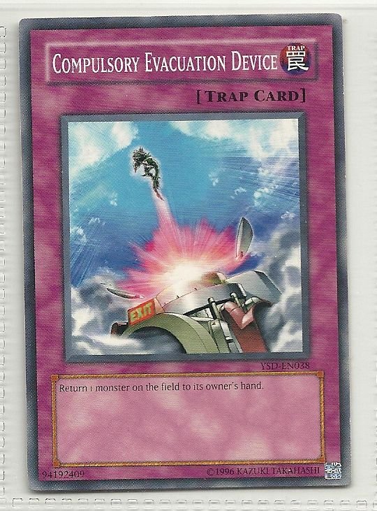more Great cards @ www.everythingcollectibles.biz For Sale is a YuGiOh GX Starter Deck 2006 Single Card Common YSD-EN038 Compulsory Evacuation Device. all single cards are shipped in Penny Sleeves and top loaders. all orders ship with delivery confirmation as well. we usually ship within 2 days of receiving an order. Shipping is a Flat $2 no matter how many cards you buy 1