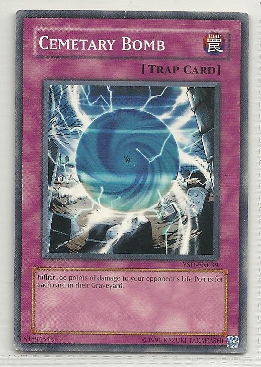 more Great cards @ www.everythingcollectibles.biz For Sale is a YuGiOh GX Starter Deck 2006 Single Card Common YSD-EN039 Cemetary Bomb. all single cards are shipped in Penny Sleeves and top loaders. all orders ship with delivery confirmation as well. we usually ship within 2 days of receiving an order. Shipping is a Flat $2 no matter how many cards you buy 1