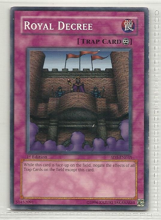more Great cards @ www.everythingcollectibles.biz For Sale is a YuGiOh GX Warrior's Triumph Single Card SD5-EN035 Royal Decree. all single cards are shipped in Penny Sleeves and top loaders. all orders ship with delivery confirmation as well. we usually ship within 2 days of receiving an order. Shipping is a Flat $2 no matter how many cards you buy 1