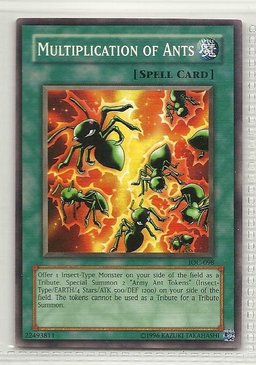 more Great cards @ www.everythingcollectibles.biz For Sale is a YuGiOh Invasion of Chaos Single Card Common IOC-098 Multiplication of Ants. all single cards are shipped in Penny Sleeves and top loaders. all orders ship with delivery confirmation as well. we usually ship within 2 days of receiving an order. Shipping is a Flat $2 no matter how many cards you b