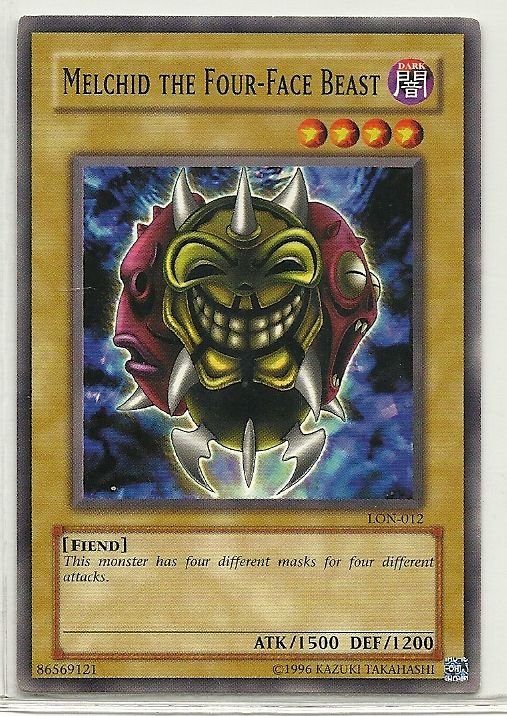 more Great cards @ www.everythingcollectibles.biz For Sale is a YuGiOh Labyrinth of Nightmare Single Card Common LON-012 Melchid the Four-Face Beast. all single cards are shipped in Penny Sleeves and top loaders. all orders ship with delivery confirmation as well. we usually ship within 2 days of receiving an order. Shipping is a Flat $2 no matter