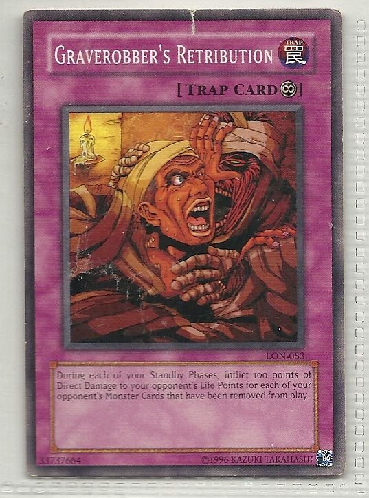 more Great cards @ www.everythingcollectibles.biz For Sale is a YuGiOh Labyrinth of Nightmare Single Card Common LON-083 Graverobber's Retribution. all single cards are shipped in Penny Sleeves and top loaders. all orders ship with delivery confirmation as well. we usually ship within 2 days of receiving an order. Shipping is a Flat $2 no