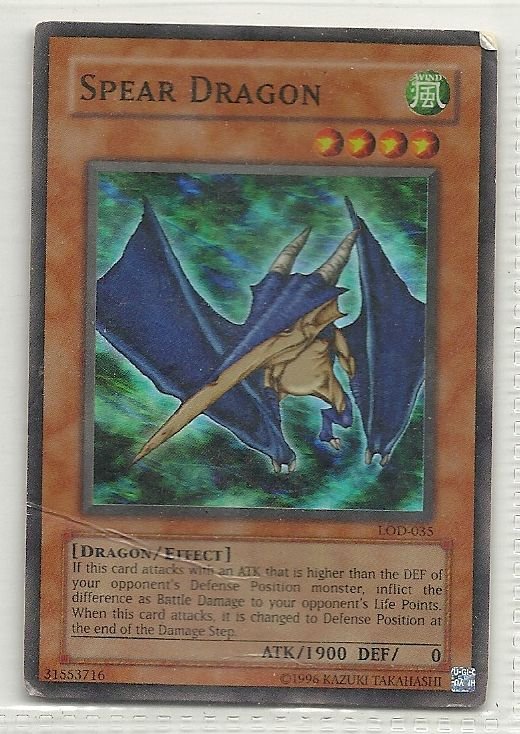 more Great cards @ www.everythingcollectibles.biz For Sale is a YuGiOh Legacy of Darkness Single Card Super Rare LOD-035 Spear Dragon. all single cards are shipped in Penny Sleeves and top loaders. all orders ship with delivery confirmation as well. we usually ship within 2 days of receiving an order. Shipping is a Flat $2
